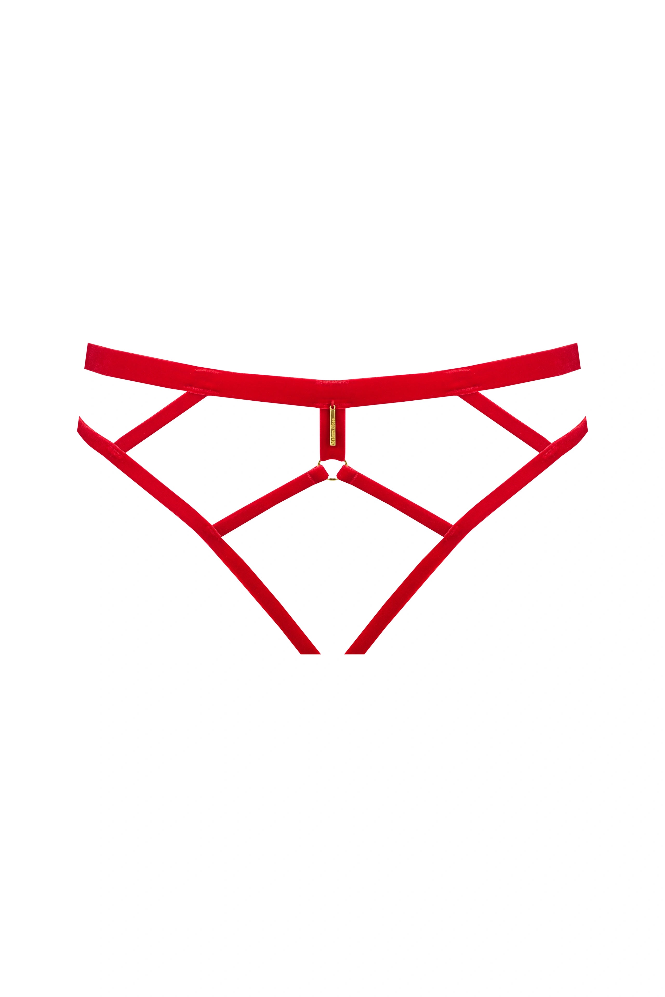 Velvet Set raudonos atviros kelnaitės. Pagamintos iš itin švelnaus veliūro, rafinuoto geometrinio dizaino, papuoštos auksiniu pakabuku su Maison Close logotipu.